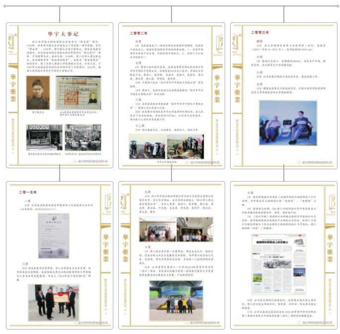 大事記主要記載浙江華宇藥業(yè)股份有限公司從一個有百年歷史文化積淀的中藥鋪,發(fā)展成為現(xiàn)代中藥飲片企業(yè)歷史篇章;